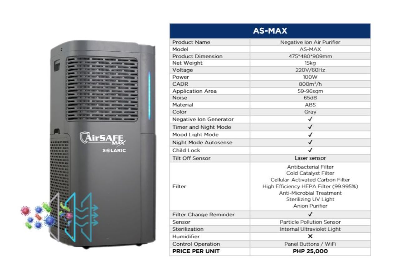 AirSAFE units may be picked up at the Solaric Showroom. You can easily have the units sent to you via courier (Grab, Lalamove, Mr. Speedy, JRS Express, etc.) Full payment must be received prior to dispatch.